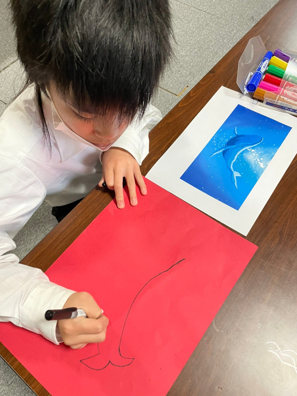 段ボールに絵を描いたり、パソコンで生き物を探しコピーし切って貼り付けたりと