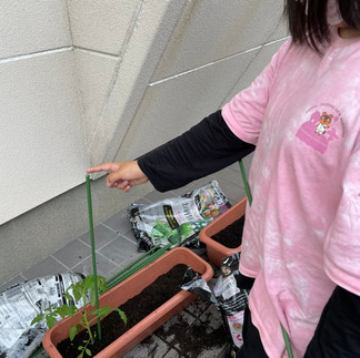 プランターや支柱は、事前に用意して、土と肥料、トマトの苗とキュウリの種をみんなで買いに行きました。